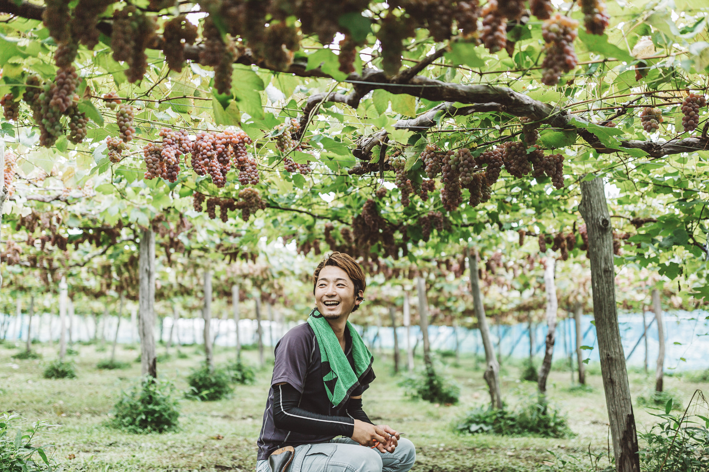 子供の頃から葡萄畑を走り回っていたという宇野さんは「宇野農園」五代目のオーナー。生まれも育ちも河北町です。「若い頃は音楽や、好きなことをやって生きてきた」という宇野さん。しかし「気がつけば父母から農家を継いでいた」のだそう。今ではデラウェアやシャインマスカットをはじめとするぶどう複数種、桃、さくらんぼ、そしていつかワインと一緒に提供したい、ヘーゼルナッツなど、畑には閑散期がないほど多くの作物を手がけています。土地×時間×労力を余すところなく、いかに生産性とおいしさを最大化するか、毎年が挑戦です。「戦略を練ってその結果がその通りに返ってくる。自分の頭で考えたことが実となるところが農業の魅力です」。農業の楽しさを語る宇野さんは、畑の中でキラキラとした笑顔を見せてくれました。宇野さんの夢は、ストーリーのあるギフト商品を作ること。例えばぶどうとワインをセットでギフトにして、河北町のぶどうを丸ごと味わってほしい。「もし、ワインラベルのどこかに自分の名前なんかがちょっと入っていたら、もう最高ですね!」